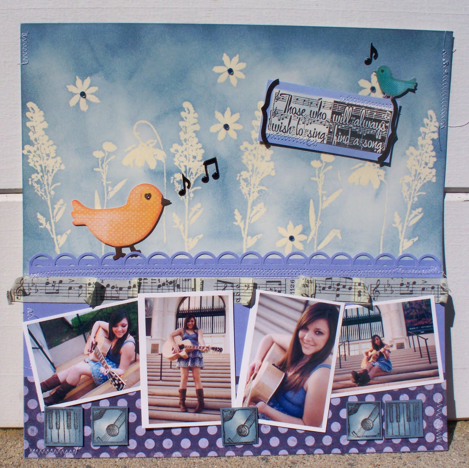 My vacation is almost over I spent a lot of time in my craftroom this week,it was wonderful. This layout was done with clear embossing powder and rubber stamps, I also was able to us some note brads that I have been saving. The new Tim Holtz Tissue tape is also one of my favorite things to use lately, along with his Distress Ink.